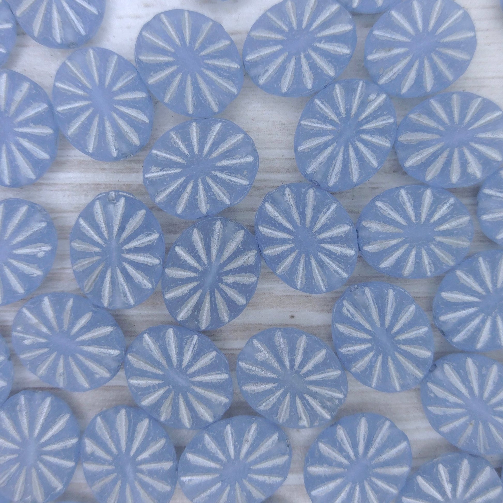 This is a pack of 10 Flat Oval, glass beads in Matt Alexandrite with Silver, which were made in the Czech Republic. They measure 14mm by 12mm and are about 3mm thick. The Czech number for this colour is 20210/54301/84100.