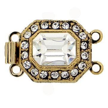 This is a high quality 23 carat gold plated clasp from Neumann and has been made with CRYSTALLIZED Swarovski Elements. There is 1 large Swarovski crystal in the centre and 18 smaller Swarovski crystals around the edge. The clasp measures about 14 x 12mm, has 2 rows and a springtongue mechanism. It has been made in Germany so has been made to high environmental standards- with best quality base and production methods. All Neumann clasps are nickel free. Please note that the photo shows the Antique Gold clasp, so these clasps are a brighter gold colour.