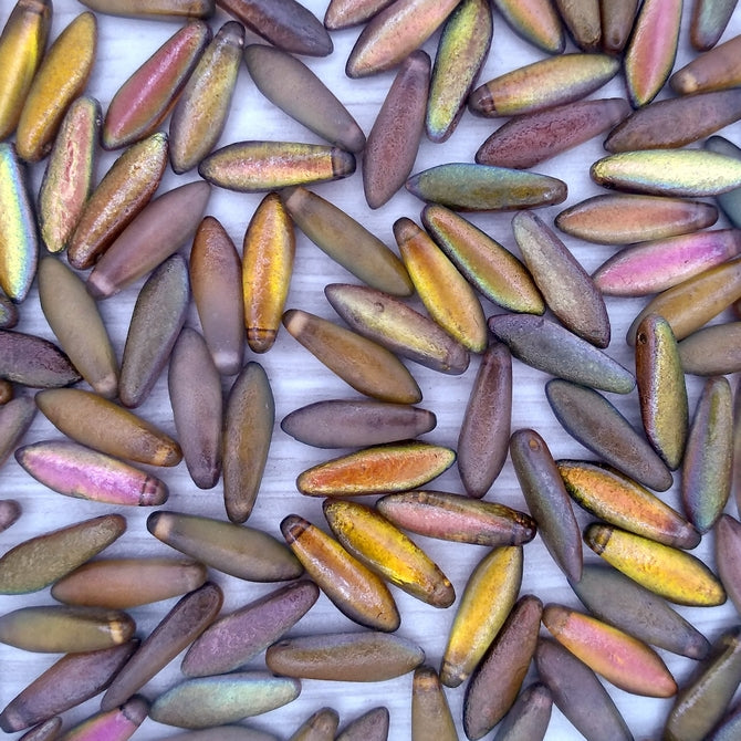 This is a pack of 10 top-drilled- glass daggers in etched Magic Copper. They are 16mm long- 5mm in diameter and were made in the Czech Republic.The Czech number for this colour is 00030/95300E.