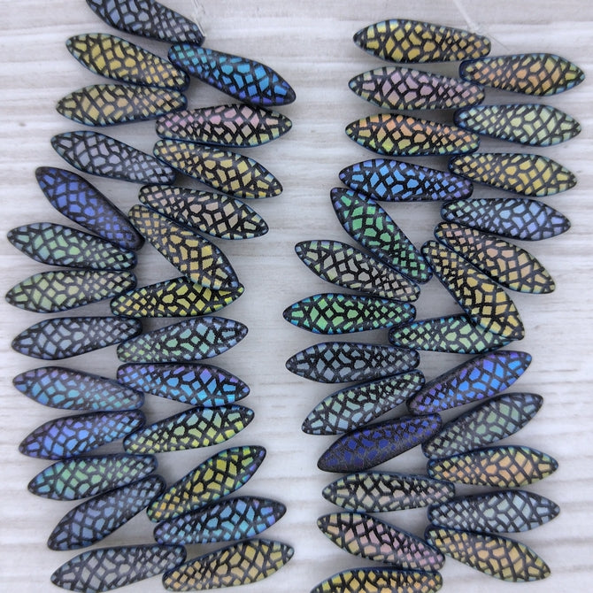This is a string of 25 top-drilled- glass daggers in Matt Black with a Crocodile pattern. Each bead has been individually printed so the design is in same place on each the bead. They are 16mm long- 5mm in diameter and were made in the Czech Republic. They have a Laser Etched coating which will not rub off.