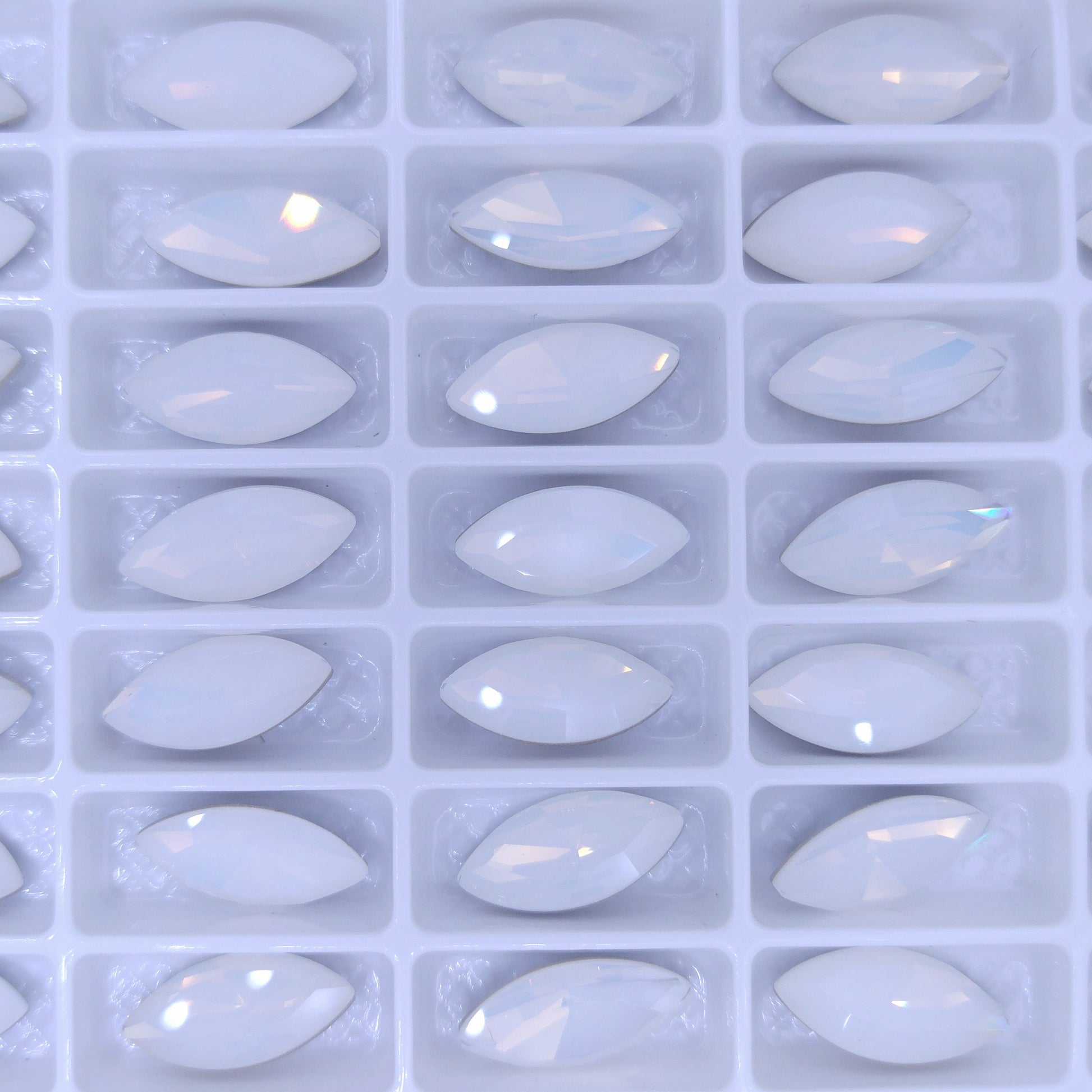 This is a 15x7mm navette from Aurora in White Opal with a silver foiled back. It was made by Aurora in China and is very similar to Swarovski's A4200.