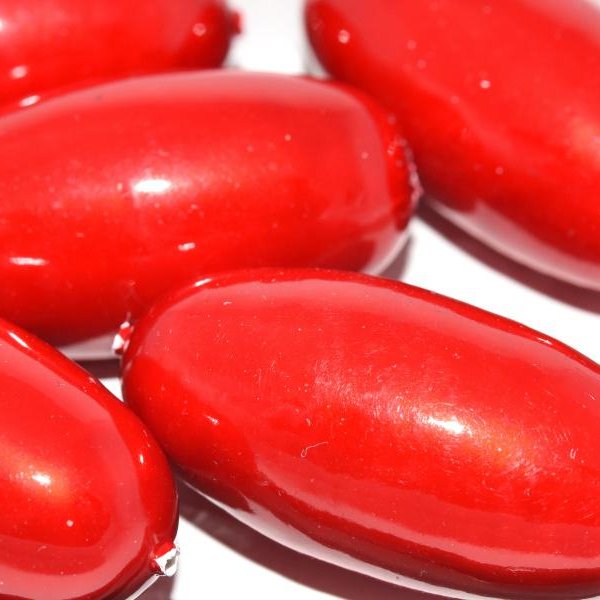 This is an olive shaped bead in Red Pearl which has been made from Paper Mache making it lightweight. The bead measures approximately 40mm by 18mm with a hole through the longest part of the bead.