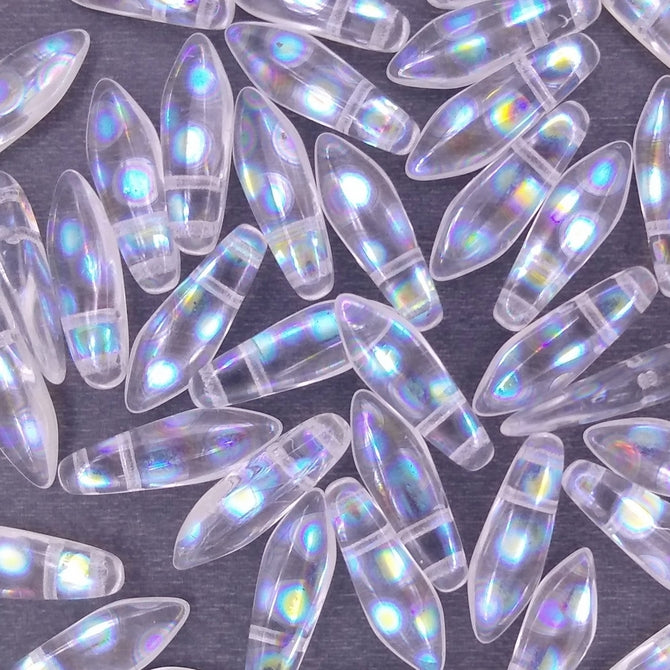 This is a pack of 10 top-drilled- glass daggers in Crystal with AB spots. They are 16mm long- 5mm in diameter- were made in the Czech Republic and have two holes.The Czech number for this colour is 00030/2870A.