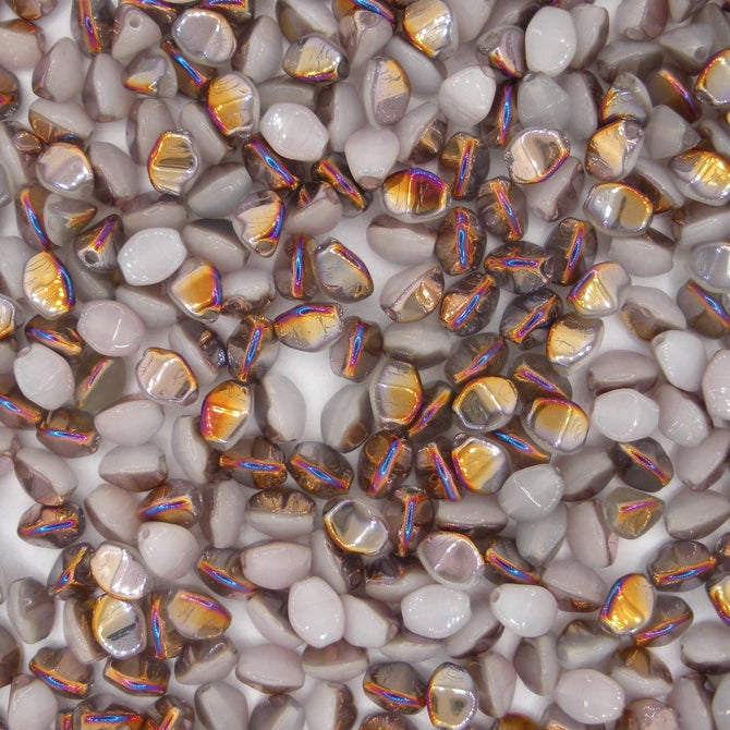 This is a pack of 50 Alabaster / Sliperit glass pinch beads. They are 3mm by 5mm and were made in the Czech Republic. They are oval in shape with three flattened sides- and can be used instead of faceted beads or bicones.The Czech number for this colour is 02020/29500.