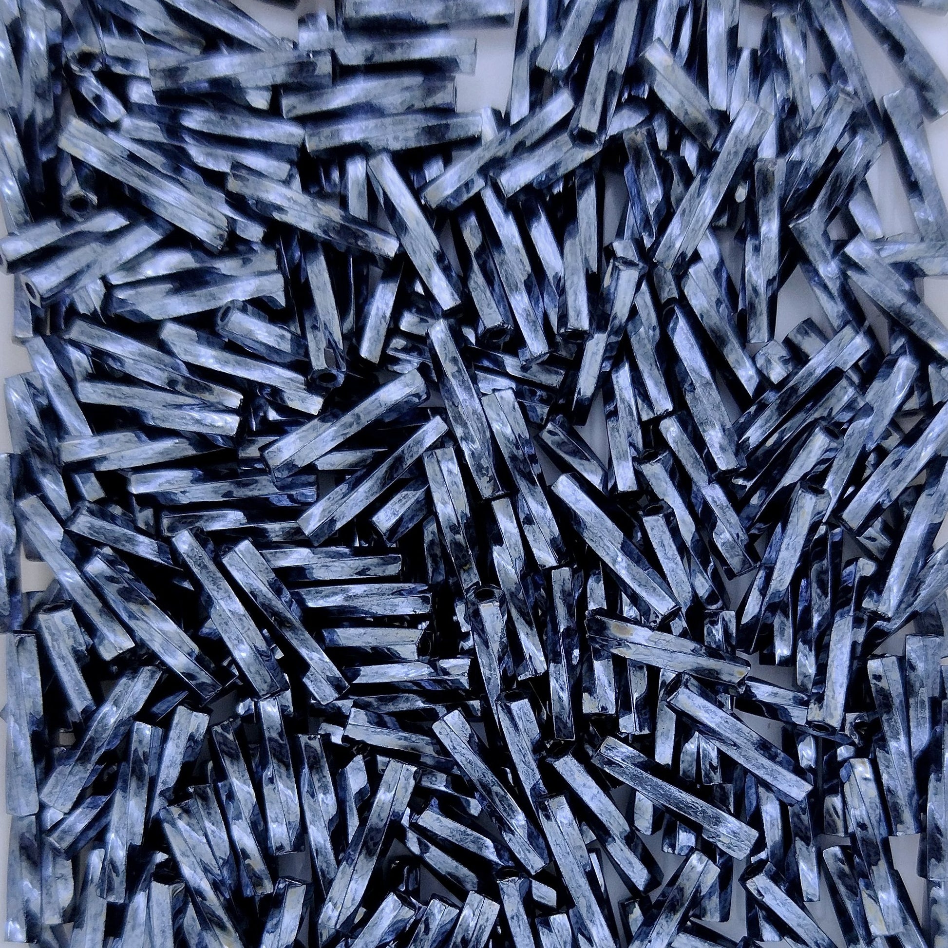 This is a 10g pack of 9mm twisted bugles in Gunmetal. They were made by the Japanese company Miyuki. The Miyuki number for this colour is 0451.