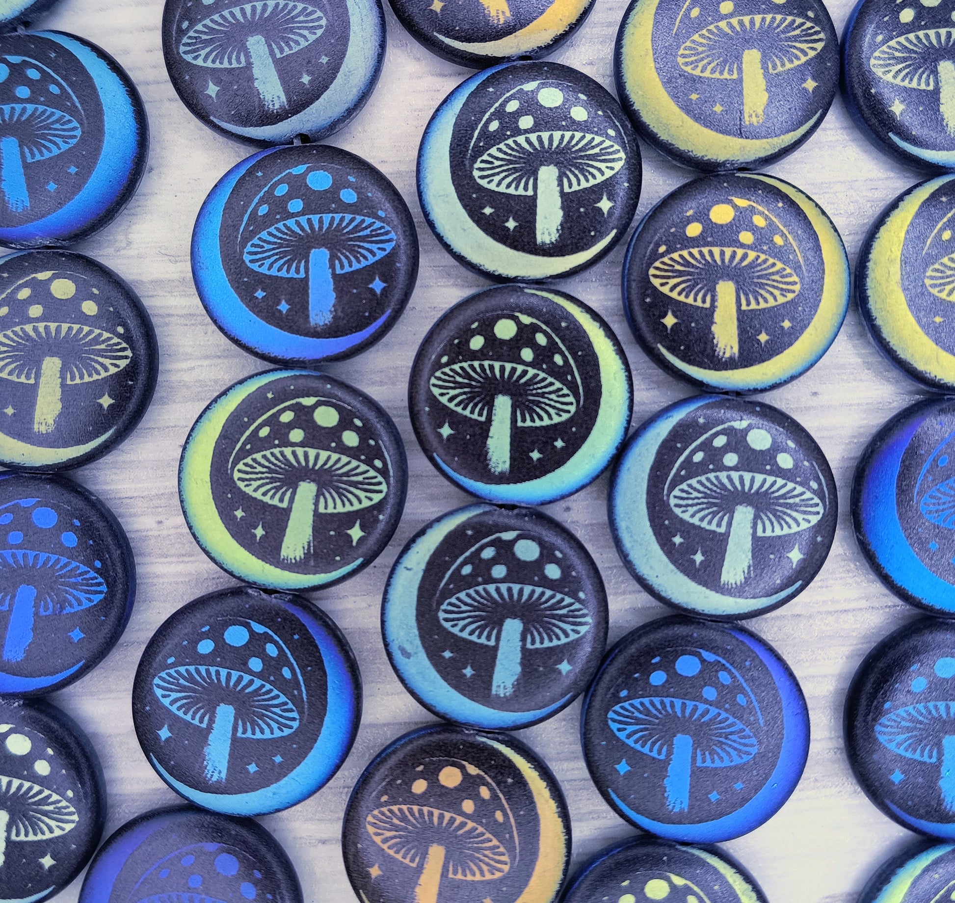This is a pack of 8 Matt Black glass beads with a toadstool design on them. They were made in the Czech Republic and the beads are approximately 17mm in diameter and 4mm thick. They have a Laser Etched coating which will not rub off.