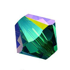 This is a pack of 24 Emerald AB glass bicones from Preciosa in the Czech Republic. The bicones are 4mm in diameter and are described as MC bead rondelles.
